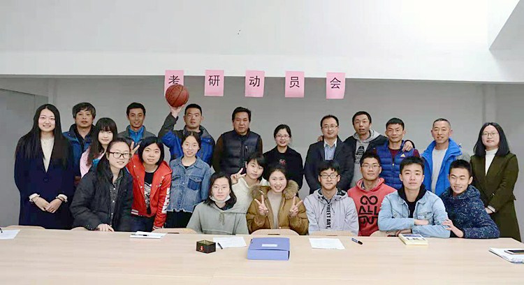 在体育教研部组织的考研动员会上,学院考研工作有关负责人、考研指导教师与考研学生合影