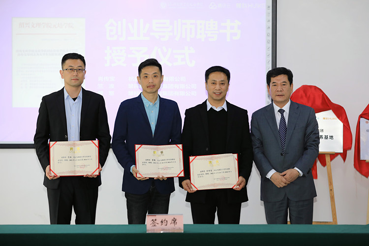 学院党委书记叶访春(右一)为大学生创新创业导师慧科集团合伙人、副总裁曾慜(左二)、慧科集团华东区总经理竺浪(左一)和杭州魔点科技有限公司CEO肖传宝(右二)颁发聘书
