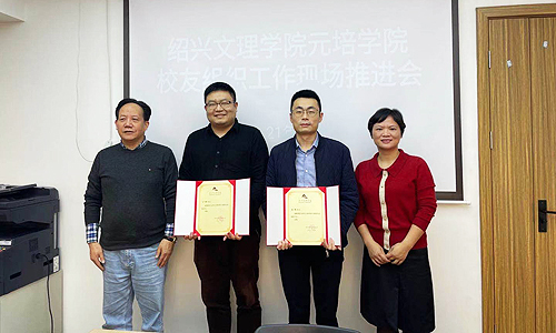 夏婷、王祝耿向丁博(图中左起第2位)、吕栋(图中左起第3位)分别颁发学校宁波校友会副会长、副秘书长聘书