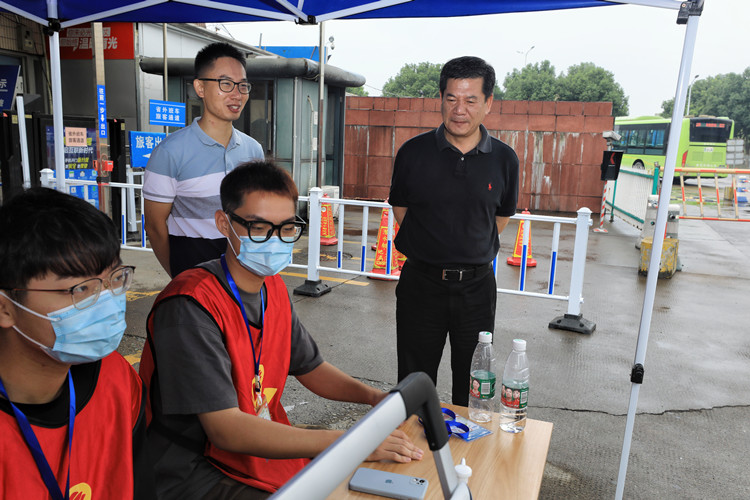 9月7日上午,在西大门和迎新工作现场,院领导们认真察看了进校疫情防控部署落实情况、医疗服务点、家长饮水区、校内迎新接待点、绿色通道办理处等地,与迎新工作人员和志愿者亲切交谈,听取迎新工作情况汇报,详细了解新生报到情况和迎新工作进度,向坚守在迎新工作一线的各分院院长、书记、辅导员、班主任、班助、学生志愿者等表示感谢,对学院开学疫情防控工作和迎新工作给予肯定。