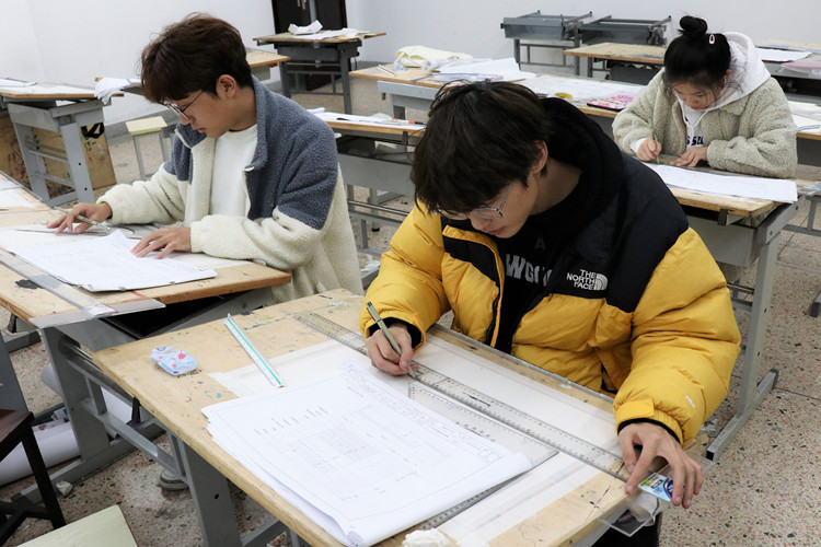 “考试的时间是连续六小时,就平时练习来说,我要花远远多于六小时的时间去琢磨。”对她而言,画画是体力和脑力的双重“折磨”,长时间的静坐、思考以后,完成一套图常常令她腰酸背痛、精疲力竭。“画完一套图比做一整天的题还要累。”她开玩笑地说道。为了在考场上熟练运用自己的模板、能有出色的临场发挥,练习之外,她不停地在微博、微信公众号、小红书等平台搜集素材与灵感。画笔在白纸上停停走走,一路为梦想“摸爬滚打”,她期待自己能如愿上岸,给自己交出一份满意的答卷。