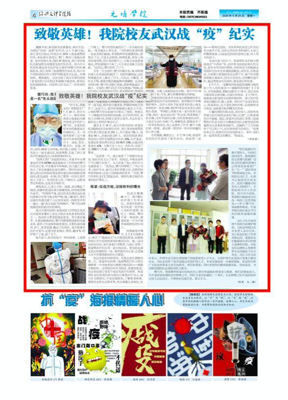 近日,2020年度浙江省高校好新闻作品评选结果公布,经浙江省新闻工作者协会、浙江高等教育学会高校校园传媒分会评审,我院选送的3件作品获奖。其中,汉语言1801班钟佳苗撰写的《致敬英雄!我院校友武汉战“疫”纪实》获通讯类二等奖;齐陈蕴编辑的《绍兴文理学院元培学院报》2020年05月25日第1期第04版、2020年05月25日第1期23版分别获版面类二等奖、三等奖,获奖等级、数量均上新台阶。