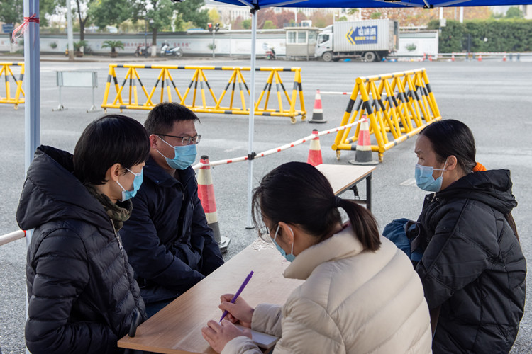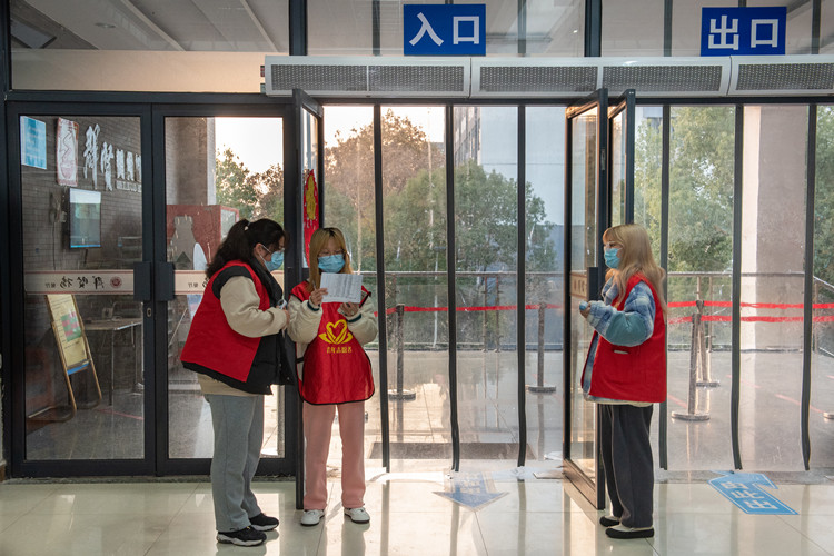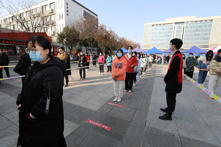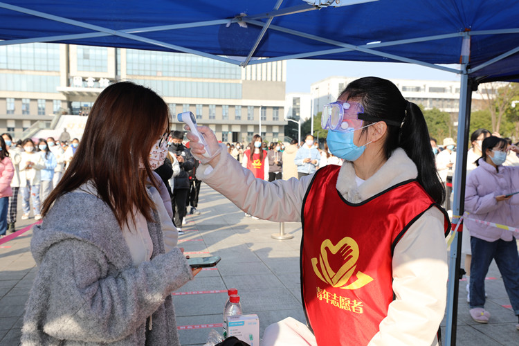 12月13日、16日,学院启动两轮全员核酸检测工作。当天中午,百余名学生志愿者组成的队伍立刻集结起来,参与防疫工作培训。如何使用测温仪?如何进行信息登记?如何注册相关APP……志愿者们专注地倾听着每一条注意事项,并将要点牢记在心。“同学,请间隔一米排队等待。”“请出示健康码!”16条采样通道上,测温、登记、放行,测温、登记、放行有序进行,红色的身影来来回回走动着,从未离开。同样的动作重复了成百上千次,繁复的工作持续近10个小时。