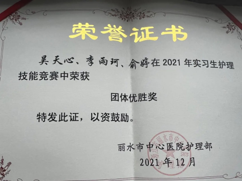 护理1812吴天心、李雨珂、俞婷在浙江省丽水市中心医院2021年实习生护技能竞赛中荣获团体优胜奖