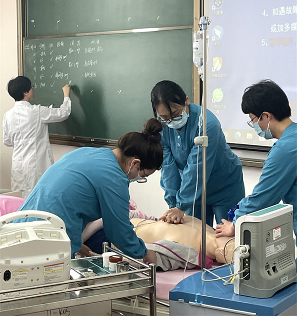 “1001、1002、1003、1004......患者无意识,无自主呼吸,脉搏微弱,开始进行心肺复苏。”“充电,再次确认患者脉搏心跳、清场、除颤。”日前,这一幕情景发生在医药与健康分院急危重症护理学的课堂上。授课教师、绍兴市人民医院副主任护士黄春华、主管护师马玉婷、徐唯超和护师董晓倩走进我院,把高仿真全要素临床抢救仪器、药品、医用护理人体模型搬到课堂上,为我院护理学专业学生们现场演示了争分夺秒、紧张刺激的成人心肺复苏术抢救全过程。从胸痛患者入诊到完成抢救,整个过程大约持续了15分钟。演示完毕后,教室里响起了热烈的掌声。