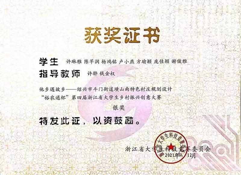 怀揣热爱,秉持初心,努力、踏实的陈芊润在四年中从一名参赛者蜕变成团队的带领者,与“原郷客”团队先后在浙江省“农信杯”大学生乡村振兴大赛、元冶杯大学生国际竞赛、绍兴市乡村振兴大赛等国家级、省级、市级设计竞赛中斩获八次前三名。