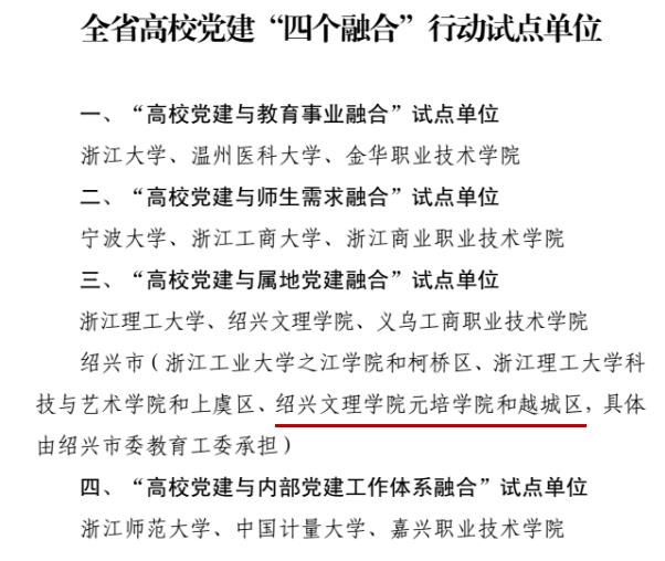 日前,浙江省委教育工委下发《关于确定高校党建“四个融合”行动试点单位的通知》,我院成功获批全省高校党建四个融合行动试点单位,成为“高校党建与属地党建融合”试点单位之一。