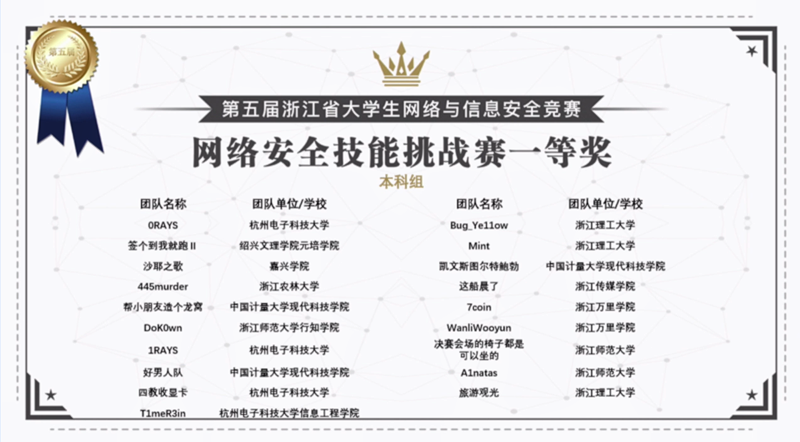 近日,浙江省大学生科技竞赛委员会传来捷报,我院学子在第五届浙江省大学生网络与信息安全竞赛中创佳绩。在技能挑战赛中,由施滢琦、刘明嘉、赵宁组成的团队获得浙江省一等奖,李雅程、林德钢、郭钊恺组成的团队获得浙江省三等奖;知识挑战赛中,龙旭东、张峻涛两位同学分别获得浙江省一等奖2项,马叠良同学获得浙江省二等奖1项,李卓屹、张认、刘泽林、郑依楷、张以诺、叶茂斌、杨佳栋、邱宇杰、严志键、沈佳科、张恩雨、应奇钢十二位同学分别获得浙江省三等奖12项(指导老师:徐志望、张祎江、杨婷)。