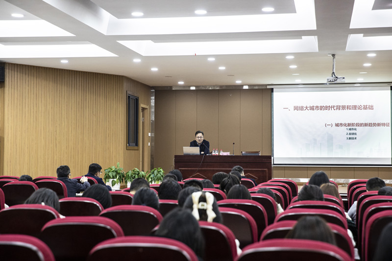 会上,金斌院长从网络大城市的时代背景入手,紧密结合实践案例,从城市化新阶段的新趋势新特征、新时代新目标的新挑战新路径、绍兴网络大城市空间结构、绍兴近期重点打造的特色精品片区等方面条分缕析式地讲解。报告脉络清晰、内容丰富、重点突出,既有理论高度,又有实践厚度,紧扣社会迭代推动城市演进主线;报告呈现的具体内容紧扣绍兴实际,以展望未来的视角分析呈现趋势,具有很强的现实性、针对性和前瞻性,不时引发师生共鸣,大家纷纷表示深受启发和教育。