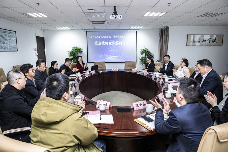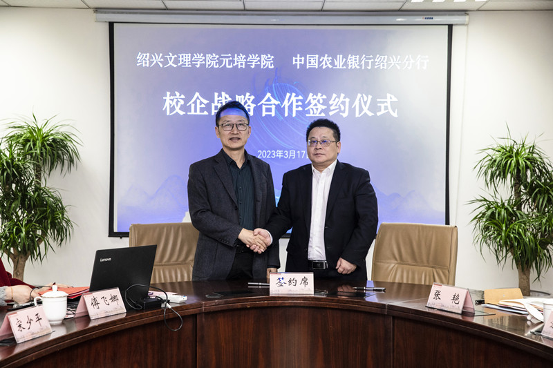 3月17日下午,学院与中国农业银行绍兴分行签订全面战略合作协议。农行绍兴分行行长陈洲、副行长杨剑和申燕,学院院长沈红卫、副院长沈玮出席签约仪式。