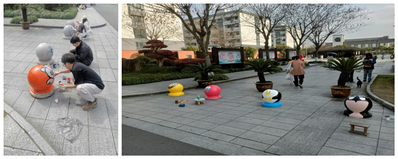 纺织服装与艺术设计分院王铮铮老师联合基建后勤处带领视觉传达专业学生彩绘校园的隔离墩与井盖等,通过辛勤劳动让石墩不再“冷冰冰”,成为了校园文化的展示者和传递者。“非常支持学院进行校园美化,能运用自己的专业所长为校园建设出一份力,不仅美化了校园的环境,更培养了同学们热爱劳动、吃苦耐劳、团结协作的优秀品质。”视觉传达2001班徐桢豪说。