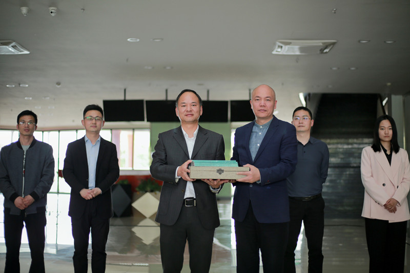 绍兴市文联副主席、市书法家协会主席陈建明向学院党委副书记石旭明赠送《绍兴市第十届大学生书法竞赛作品集》