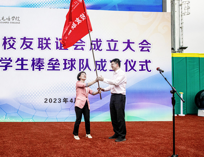 学院党委副书记石旭明向大学生棒垒球队授队旗