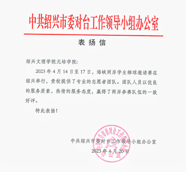 近日,中共绍兴市委对台工作领导小组办公室发来表扬信,对我院青年志愿者团队在近期举行的海峡两岸学生棒球邀请赛中的志愿服务表现给予高度赞扬。信中指出,团队人员以优良的服务质素,热情的服务态度,赢得了两岸参赛队伍的一致好评。