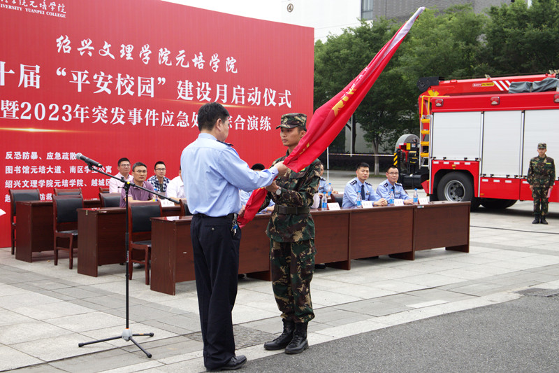 启动仪式上,保卫处负责人介绍第十届平安校园建设月活动安排,张幼良向学生义警(校园特巡队)授旗,学生义警(校园特巡队)队长朱陆鹏表态发言,石旭明宣布学院第十届“平安校园”建设月正式启动。