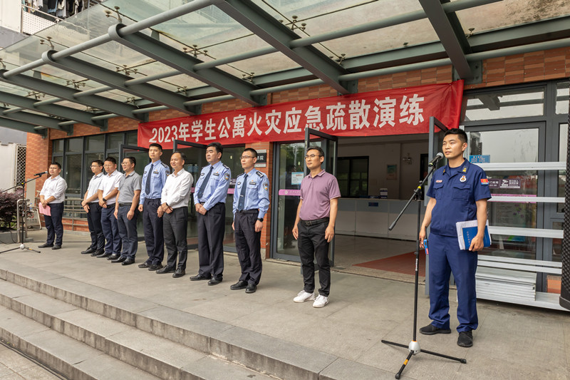 启动仪式后,学院在元培广场和南区学生公寓广场先后举行了2023年反恐防爆应急处置演练与学生公寓火灾应急疏散演练。演练模拟了反恐防暴、火灾报警、紧急疏散、火灾扑救和营救被困人员等各环节处置流程,整体组织到位、紧凑高效,达到了预期效果,有效提高了学生安全防范意识和火灾成功逃生能力,进一步提升了学院安保队伍专业处置能力。巡特警大队民警杜英才与赵广锦高级消防长分别进行了点评与指导。