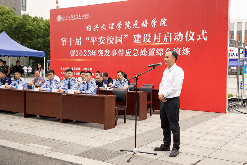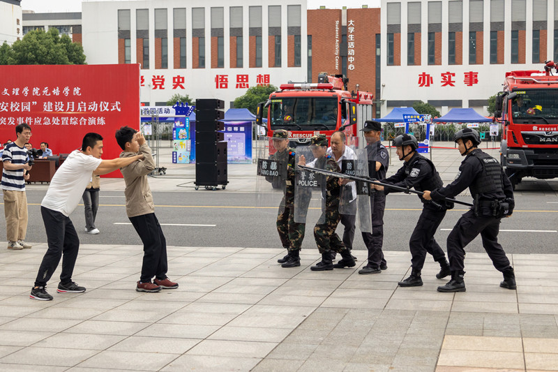 5月19日下午,学院在元培广场举行第十届平安校园建设月启动仪式暨2023年突发事件应急处置联合演练。学院党委副书记石旭明,绍兴市公安局警务装备服务中心政委、学院警务站警务专员张幼良,越城区公安分局大队长徐佳宁,学院警务站民警、阿屈工作室负责人屈伟军,东浦派出所副所长赵猛爽,越城区消防救援大队北海特勤站高级消防长赵广锦以及学院相关职能部门负责人、各二级分院分管安全工作负责人、越城区巡特警大队民警、越青雁讲师团成员、越城区消防救援大队作战员、学生义警、学院保安、义务消防队等出席仪式并现场进行了观摩学习。启动仪式由保卫处负责人主持。