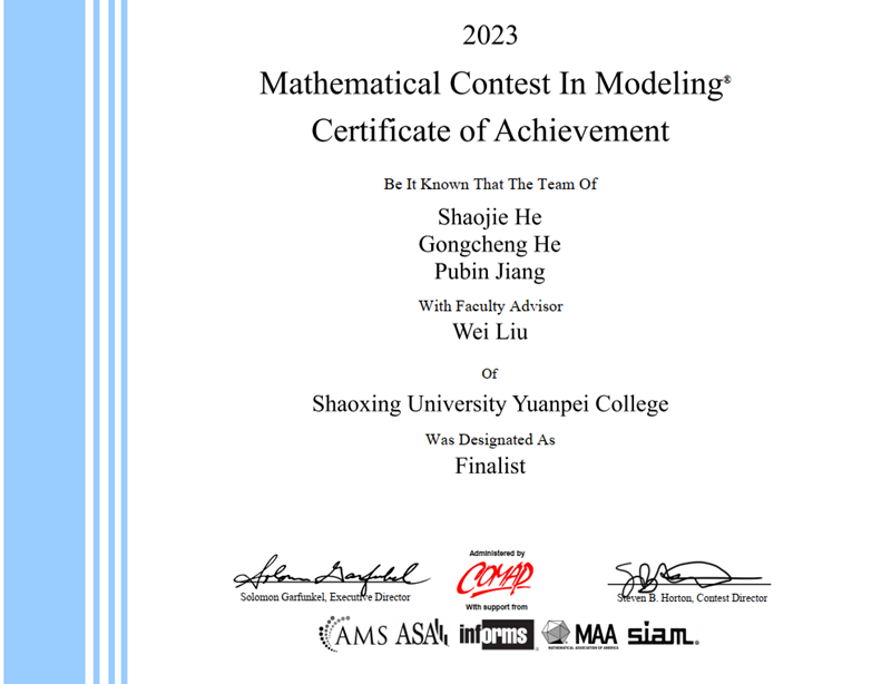 近日,2023年美国大学生数学建模竞赛成绩揭晓。绍兴文理学院元培学院参赛队与来自哈佛大学、清华大学、北京大学等国内外高校的20858支队伍同台竞技。自动化2001班何宫诚、纺工2002班何少杰、计算机科学与技术1903班姜浦彬完成的论文在全球A题论文中排名15,取得获奖率不足2.7%的Finalist奖(特等奖提名奖),“算是为我们长达近7个月的辛苦备赛画上了完满的句号。”何少杰感慨道。