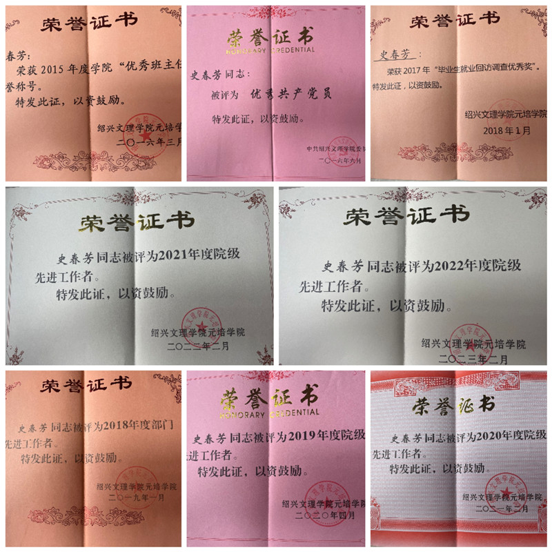 2004年至今,史春芳与元培学院的“交情”已有19年之久,自入职以来,她始终恪尽职守,始终保持饱满的工作热情、勤勉工作,力求在平凡的岗位上更好地服务广大师生,先后获得“绍兴文理学院优秀共产党员”、学院“优秀班主任”、“院级先进工作者”等荣誉称号。