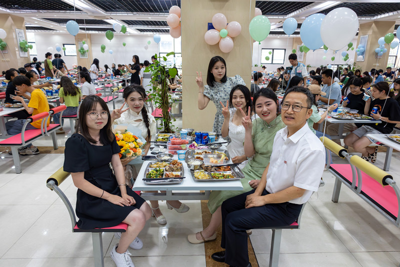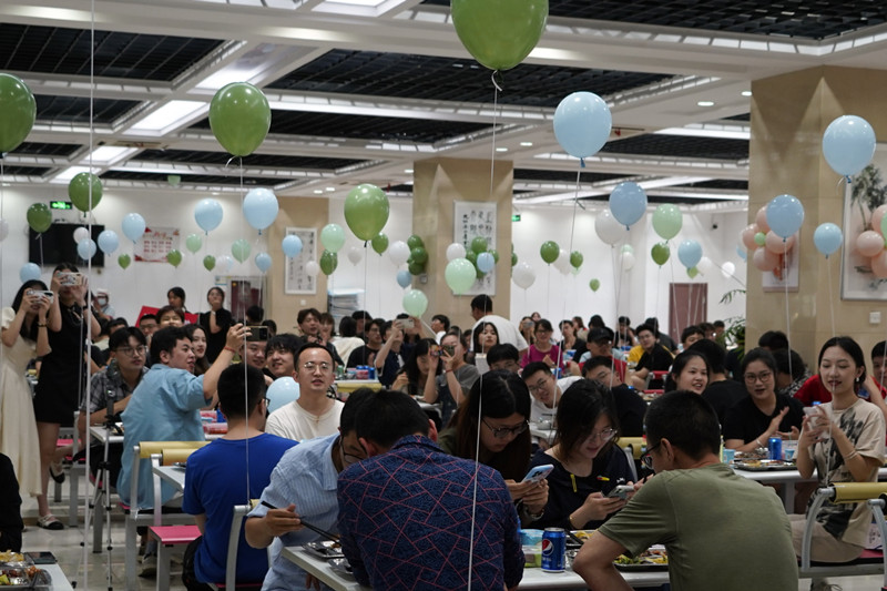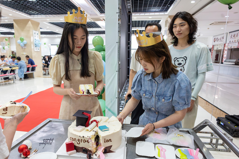 红烧大虾、葱烧排骨、餐后水果……“红毯礼”结束后,毕业生带着喜悦来到群贤楼餐厅,一边享受学院准备的“惊喜晚餐”,一边与好友谈论即将奔赴的“远方”。“很感谢学院组织的这次毕业聚餐,很有意义。这可能是我们最后一次坐在一起,吃着食堂好吃的饭菜了,温馨又感到幸福。”视传1902郑思悦说道。在这特殊的日子,学院还特地为今天过生日的两位毕业生准备了“生日惊喜”,在一声声生日祝福和掌声中,志愿者们送上了精心准备的生日蛋糕。“很惊喜,没想到可以与这么多人一起过生日,感谢学院给予的满满温暖与关怀。”法学1904司肖雨感慨道。