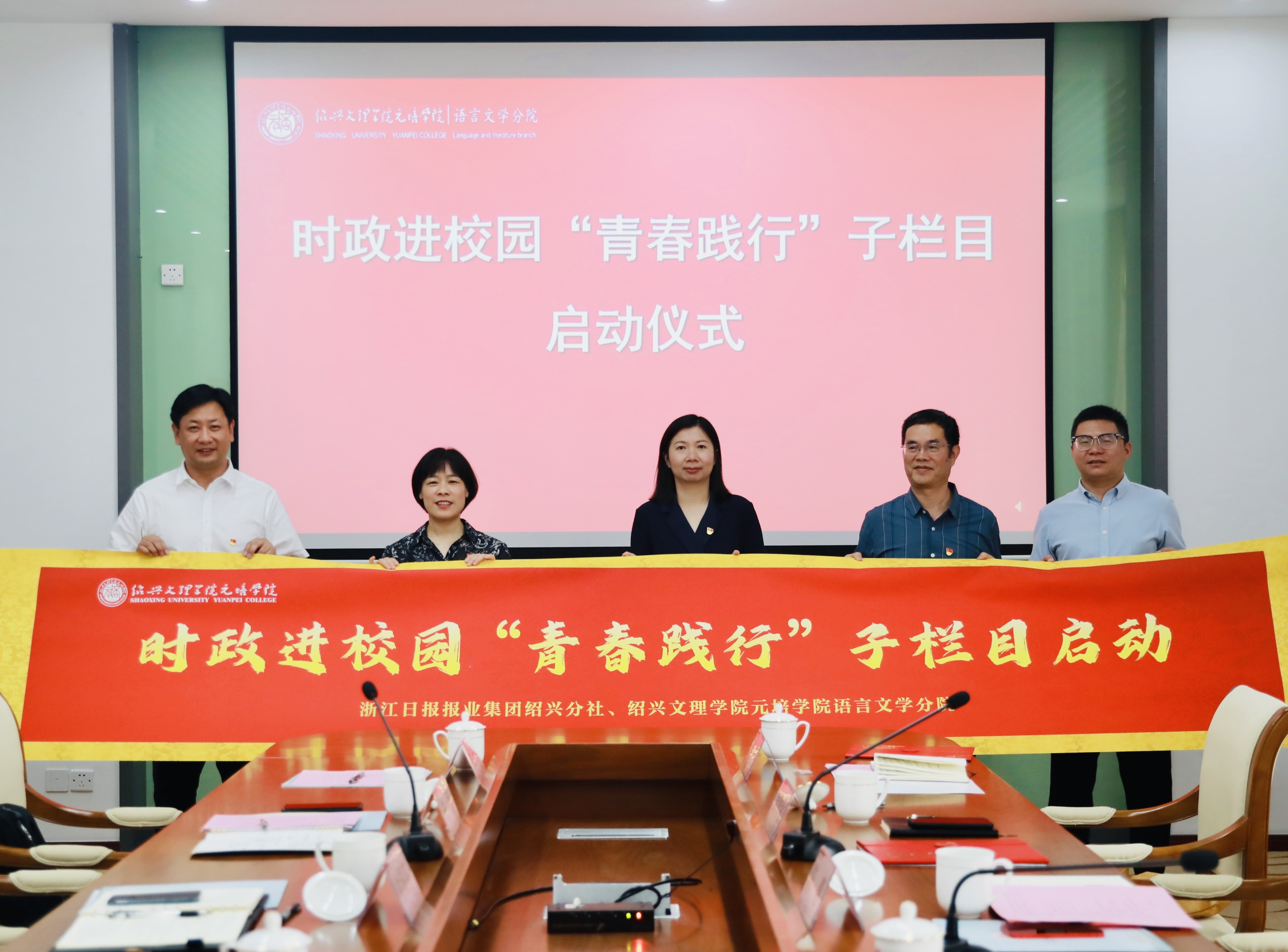 6月13日上午,语言文学分院与浙报集团绍兴分社举行双方党建共建签约暨时政进校园“青春践行”子栏目启动仪式。浙江日报报业集团绍兴分社社长陈惠,总监周智敏,学院党委副书记、纪委书记俞国芬,组宣部相关负责人、分院党总支负责人以及报社记者、分院教师代表和结对学生等出席活动。