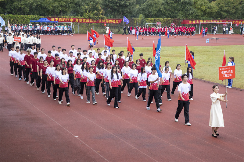 伴随着雄壮的运动员进行曲,国旗护卫队、院红旗队以及各二级分院方阵有序走来。迎着冉冉升起的五星红旗,全场师生庄严肃立,面向国旗行注目礼。