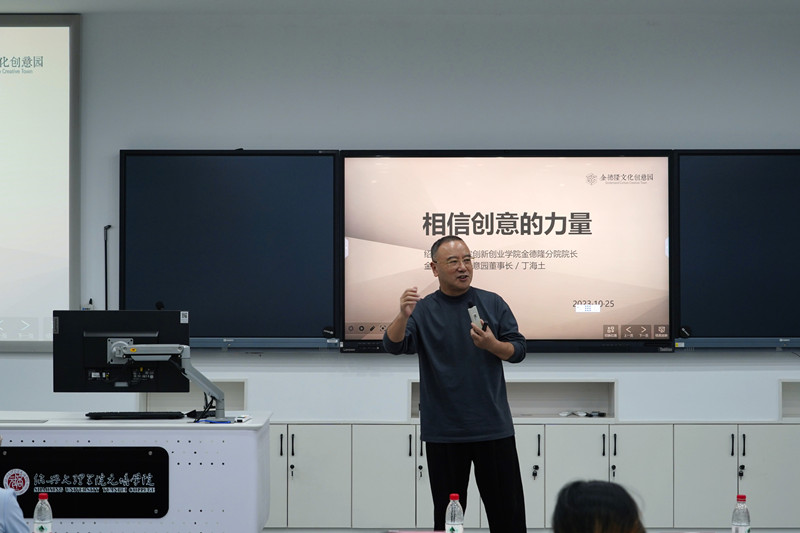 丁海土详细介绍了近年来金德隆文化创意园发展情况,并表示将以自己长期从事设计行业的经验带给师生们创意与灵感,让大家真正感受创意的力量。