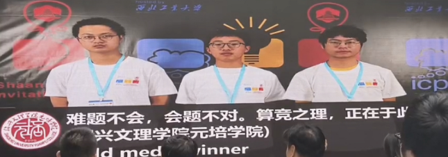 5月19日,国际大学生程序设计竞赛(西安站)在西北工业大学举行,本次竞赛吸引来自全国各地200多所高校的350支代表队参赛。经过长达五小时的角逐,由电信2101班江亚君、计算机2302班谢琳涵、计算机2104班徐冕组成的“难题不对 会题不对 算竞之理 正在于此”队凭借算法能力和团队协作精神,摘得我院在国家级程序设计竞赛中的首枚金牌。