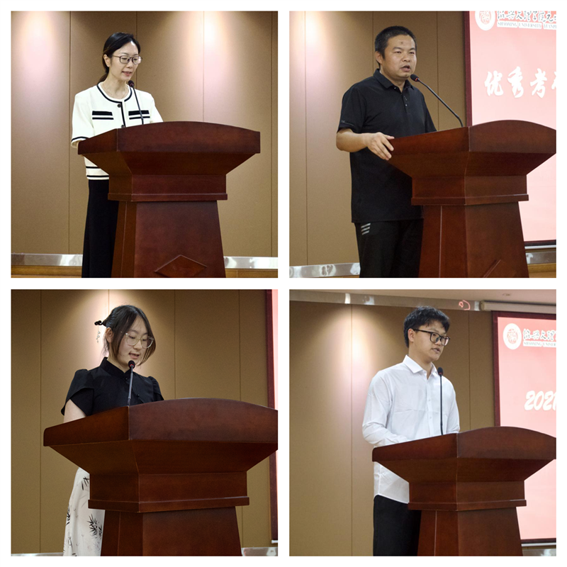 会上,石旭明宣读《关于表彰2023年度考研工作先进个人、优秀指导教师的决定》、《关于表彰2023届毕业生优秀学习标兵的决定》。柴鹏等3位教师被评为“考研工作先进个人”,何振华等80位教师获得“考研优秀指导教师”称号,罗奕欣等177位考研录取同学获得“优秀学习标兵”等荣誉称号。沈红卫、李黎分别为获奖教师以及优秀学习标兵代表颁发荣誉证书。医药与健康分院药学2003班罗奕欣、纺织服装与艺术设计分院环境设计2101班丁晓冉作为考研录取学生代表及备考学生代表发言。受表彰的教师代表、建筑工程分院教师钱金权,语言文学分院党总支负责人分别就指导学生考研、做好学生考研服务管理工作作经验交流。