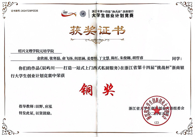 近日,浙江省第十四届“挑战杯”大学生创业计划竞赛决赛在温州大学落下帷幕。我院学生作品《辰屿川——打造一站式上门西式私厨服务》获得省级铜奖(项目负责人:金欣雨,指导教师:田野、应泓)。