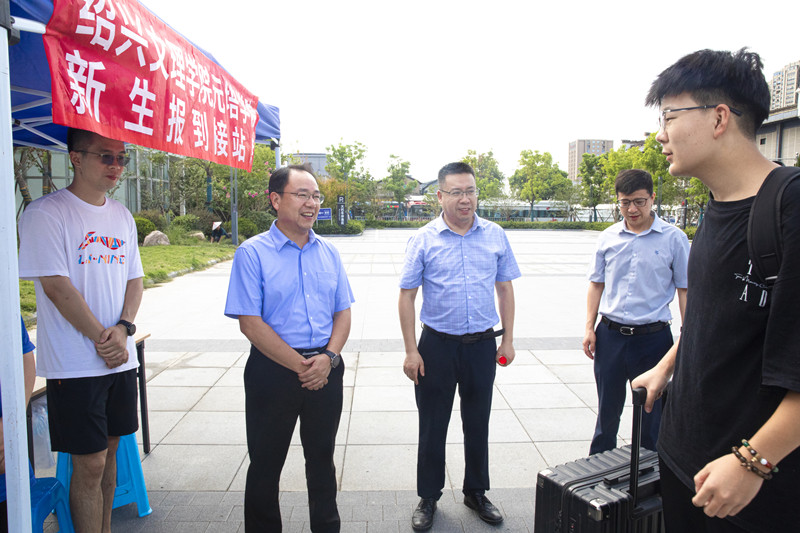 当天上午,绍兴市教育局党委委员、二级调研员马成永,校党委委员、院党委书记梁瑜,院长沈红卫在办公室、学工部负责人陪同下,深入迎新现场检查指导工作,热情迎接2024级新生,关心同学们报到情况,亲切看望慰问学院教师、迎新志愿者与一线工作人员。“你们辛苦了!”“工作还顺利吗?”“感谢大家的付出!”在各分院迎新服务点,马成永一行不时驻足,与工作人员亲切互动交流,关切询问新生报到进展情况,详细了解迎新特色、服务举措等,对各分院扎实周到的迎新工作表示充分肯定,向志愿者和工作人员的辛勤付出表示诚挚慰问和感谢。