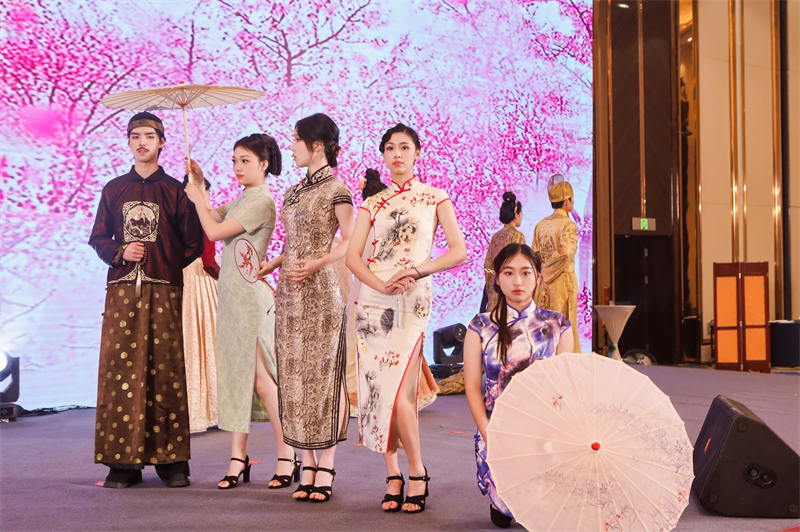 走秀现场,模特们身着精心制作的汉代、唐代、清代和民国时期的华美服饰,步履轻盈,风姿绰约。现场观众沉浸其中,感受着每一套服装承载着的文化内涵和跨越千年的华服魅力。古装走秀过后,模特们又身着由永记针纺、太泰纺织、隆豪色织、三川纺织、金卡国际等会员企业提供的现代服装惊艳亮相。