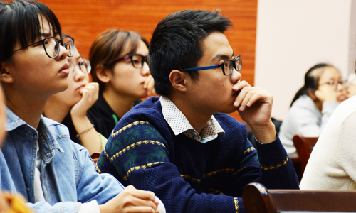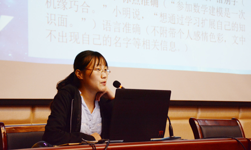 对于学院的各类新闻采编工作,新进的学生记者们一时还无法适应,摄影部的学长周君毅从摄影基础、新闻摄影、后期修片等方面进行了细致地讲解。在PPT的演示过程中,周君毅以自身拍摄的照片实例向实习的记者们说明新闻摄影方面常常出现的一些错误,以及校园新闻照片拍摄的角度、方法、注意事项等问题;文编部的黄峰将平时常见的几种新闻文体一一举例,分别讲解写作要求、技巧与注意事项等内容,围绕如何发掘校园新闻点和如何写好校园新闻与在座同学们分享了自己的经验与建议。大家或是拖着下巴认真倾听,或是动笔将要点、重点记下来,来不及记录的还用手机拍照记录下来。作为大学生媒体中心的一名老成员,马珊珊学姐浅谈了作为大学生新闻记者的工作经验,用自己的亲身经历鼓励大家多听多看,平时多去关注学院的新闻动态,将眼光放得长远些,多积累新闻素材,从而找到自己的新闻写作方法。