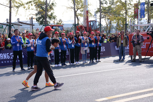 早上7点,第一批运动员到达,我院20名全半马分叉路口的志愿者们站在跑道中间,不断按响手里的喇叭:“全程马拉松请跑左边,半程马拉松请跑右边……”及时进行提醒引导。50多名场外移动厕所志愿者,在每个移动洗手间入口引导观众排队。“从最初领取参赛物品,到比赛当天起点处的安检、引导,比赛途中的补给、分流,再到终点处的搀扶、鼓劲,这一路我都能感受到你们的热情。”参加完半程马拉松赛的市民李幼娜笑着对我院的志愿者说道。