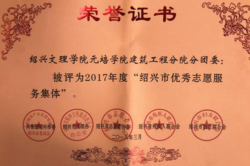 2017年,建筑工程分院分团委积极响应上级团委号召,在“一创一治”交通文明大会战、“河小二”护水行动中表现突出,并根据分院特色创建志愿服务品牌,获得多家校内外媒体报道,得到广泛好评。“护绿水青山,创美丽绍兴”、“河小二”志愿活动、绍兴国际马拉松志愿工作、文明城市复检志愿工作、“关爱聋哑儿童,温暖夕阳红”志愿活动参与人数总计达1000余人次。