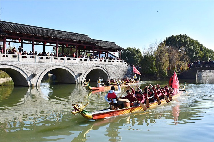 “龙腾腊月,舟舞安昌,预祝风情节圆满成功!”活动现场,我院四十余名龙舟队员伴着鼓点,铿锵有力地喊着号子。桨板起落之间,水花溅起,两艘龙舟一大一小,一前一后,龙头、龙尾相互竞逐安昌河中,舟上击鼓声、戏台上调子声、河边人群呐喊助威声汇成一片,热闹非凡,为安昌古镇居民和游客送上了一场水上盛宴。