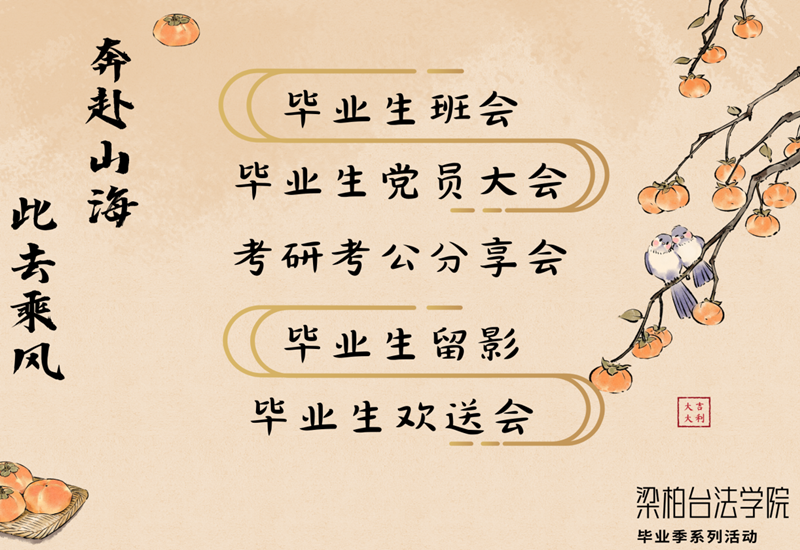 凤凰花开两季,一树送别是送给六月的骊歌,一树迎新是青年九月的序章。连日来,梁柏台法学院先后组织开展一系列温馨又富有意义的毕业季活动,温暖送行2024届全体毕业生,并送上美好祝愿。