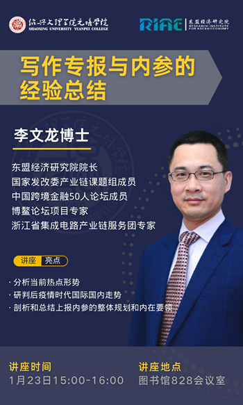 嘉宾简介:李文龙,上海财经大学博士毕业,现任东盟经济研究院院长、国家发改委产业链课题组成员、中国跨境金融50人论坛成员、博鳌论坛项目专家、浙江省集成电路产业链服务团专家;曾任国际货币基金组织(IMF)经济学家、中国人民银行总行国际司副调研员、东盟与中日韩宏观经济研究办公室(AMRO)高级经济学家。其主要专业领域是中国、东盟、“一带一路”国家及全球宏观及行业经济分析,先后在《人民日报内参》、《经济日报内参》、《全国政协内参》、《中国金融》、《新华财经》、《中国日报》、《第一财经》、《银行家》、《中国发展与改革》、AMRO网站等发表五十篇中英文论文及文章。