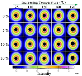 图1 特定牵伸和加热所诱导静电纺纤维二维广角X光衍射图