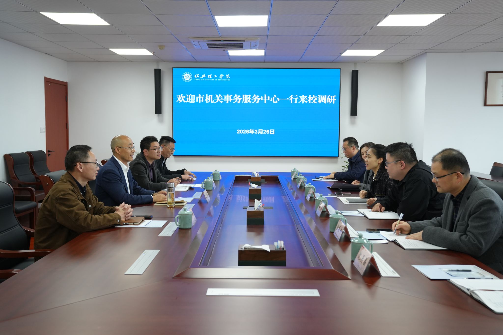 3月26日下午,绍兴市机关事务服务中心主任刘晓庆一行来校调研,学校党委委员、副校长王华锋出席会议,双方围绕节能节水及绿色低碳行动等内容进行深入研讨。